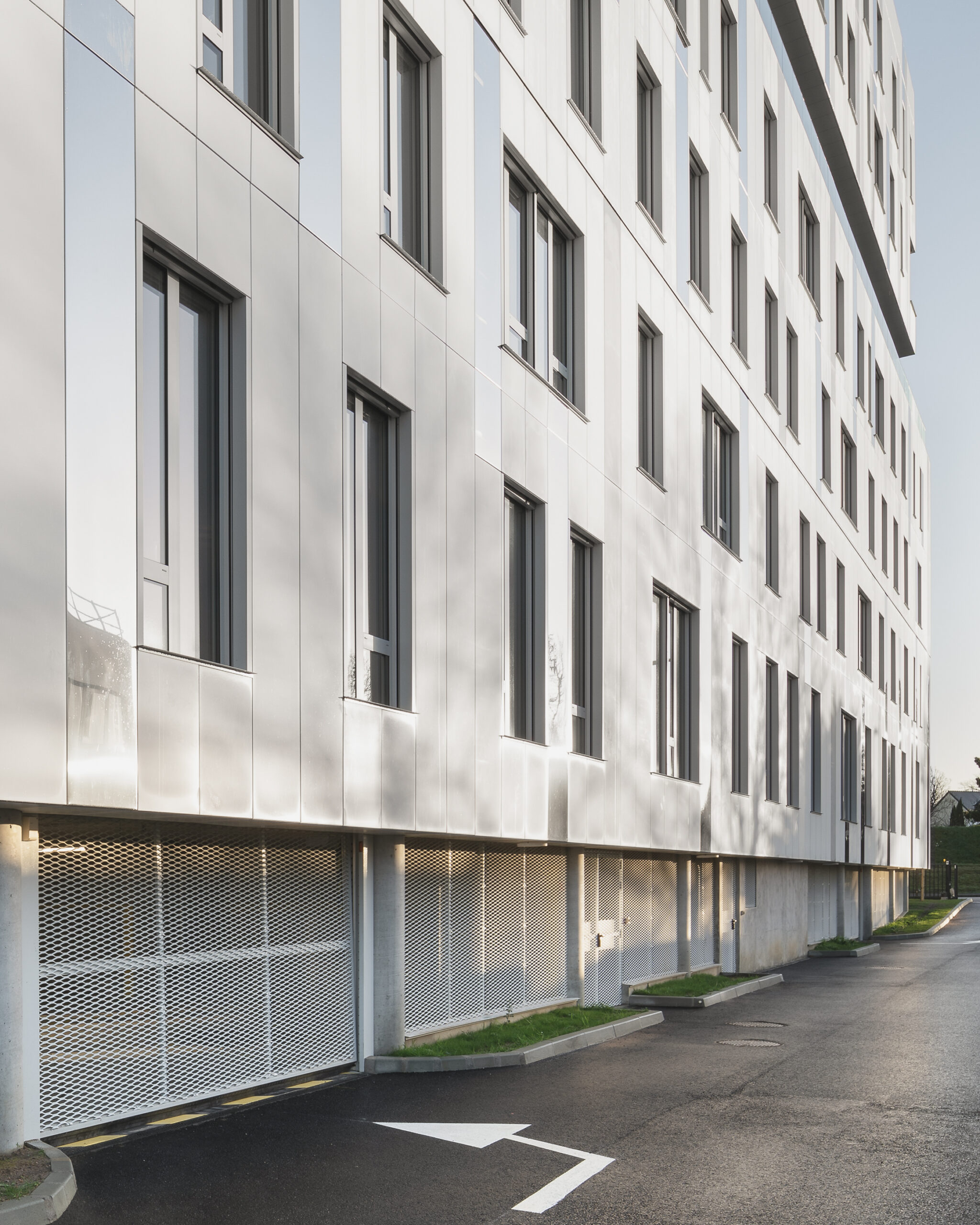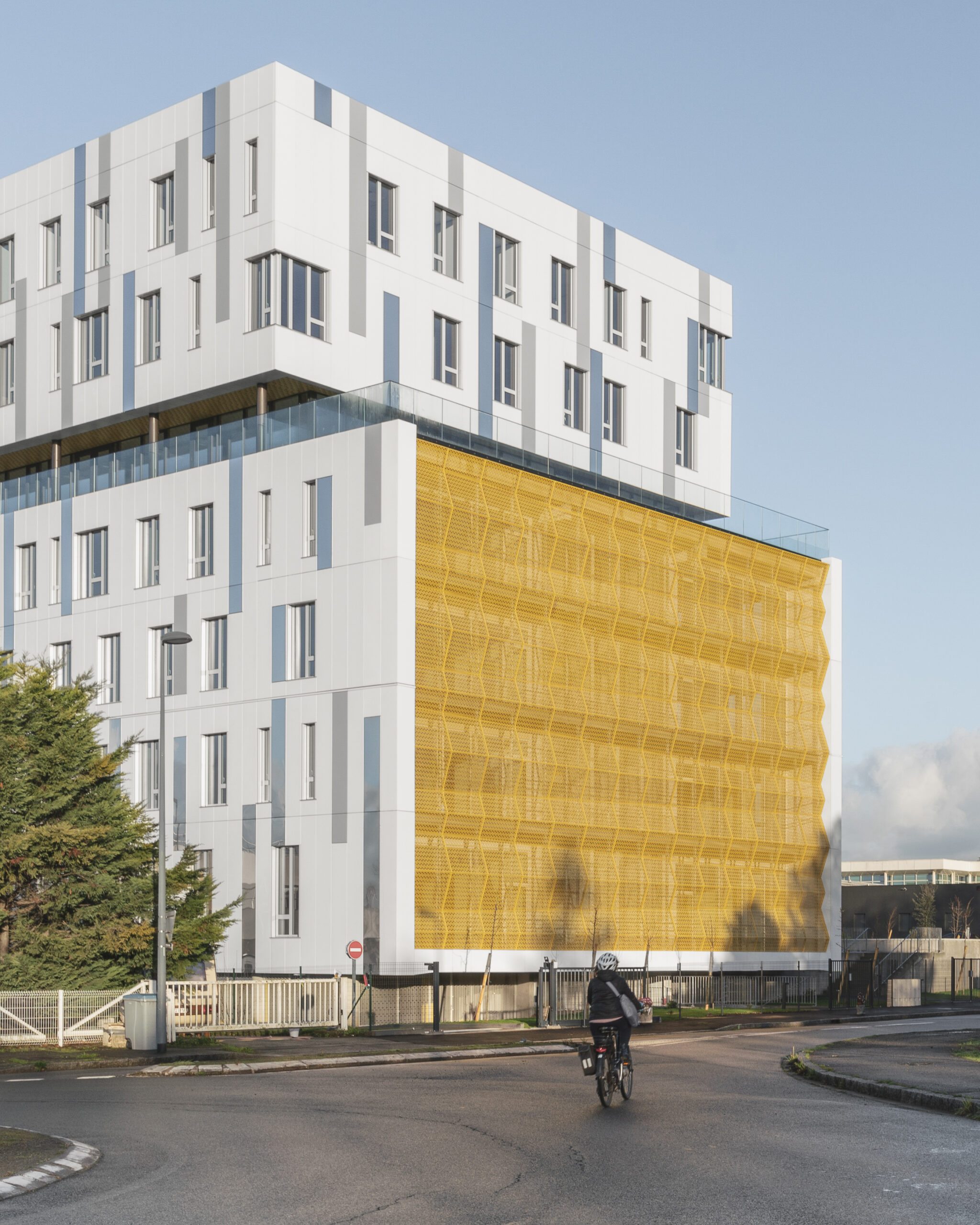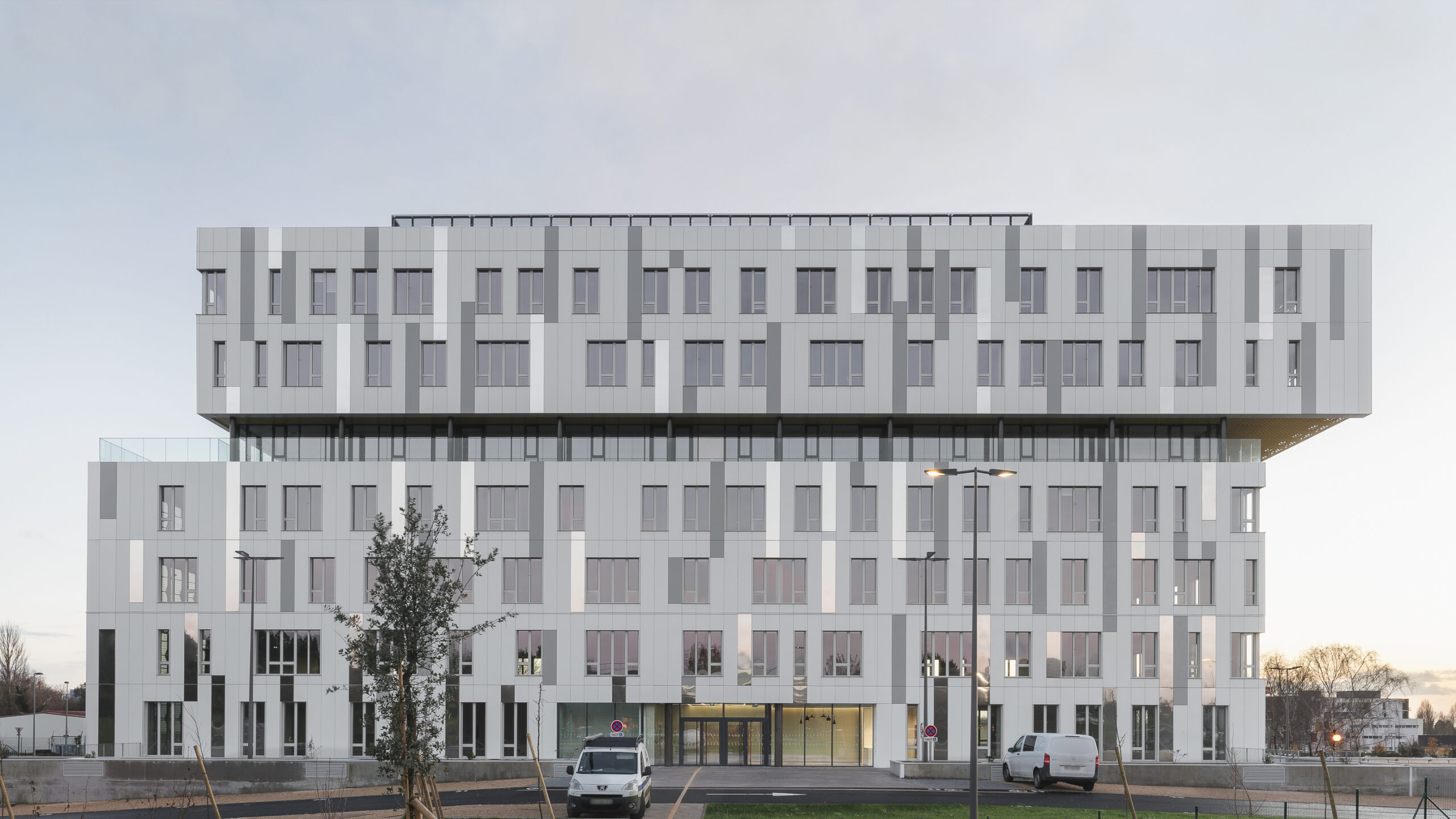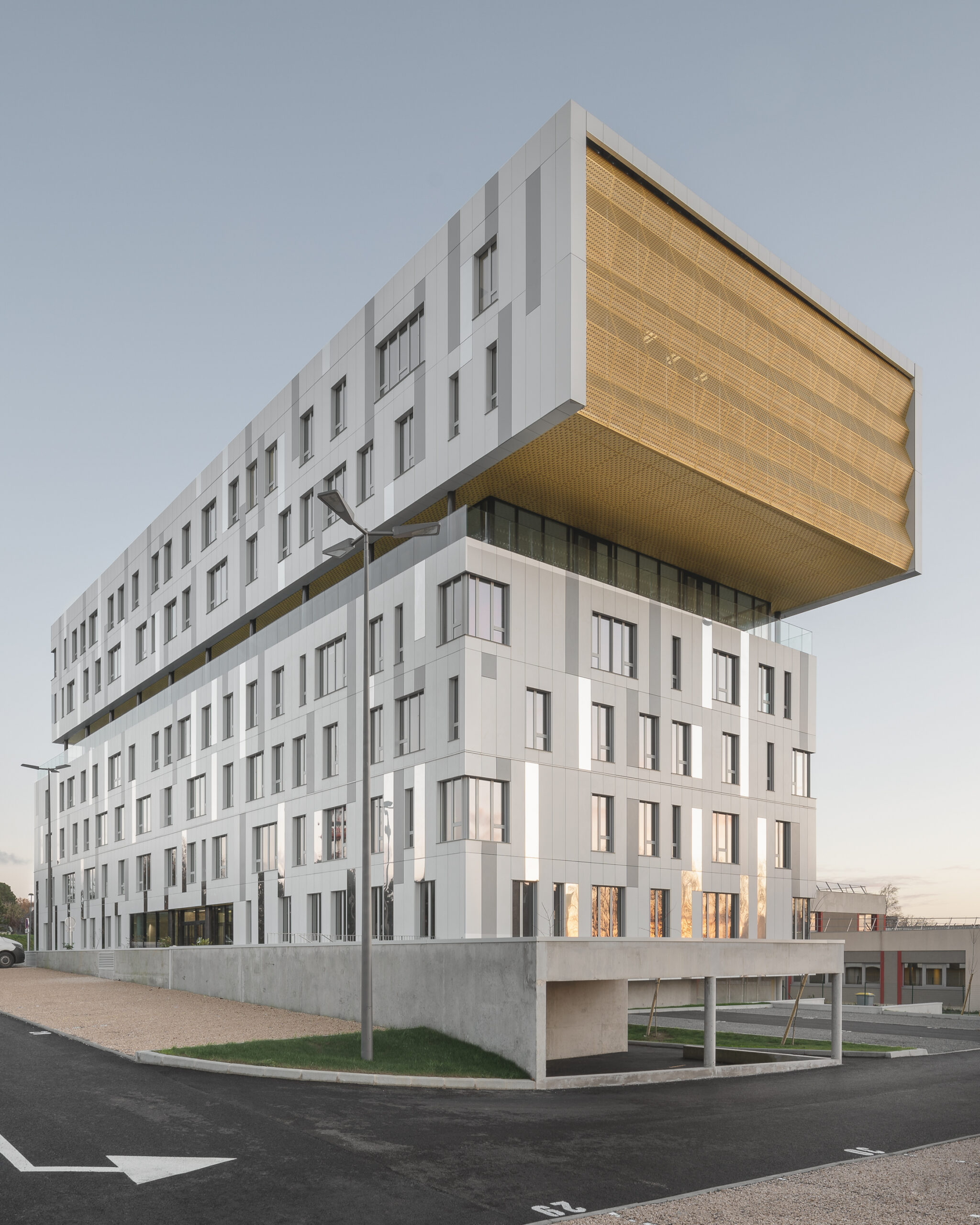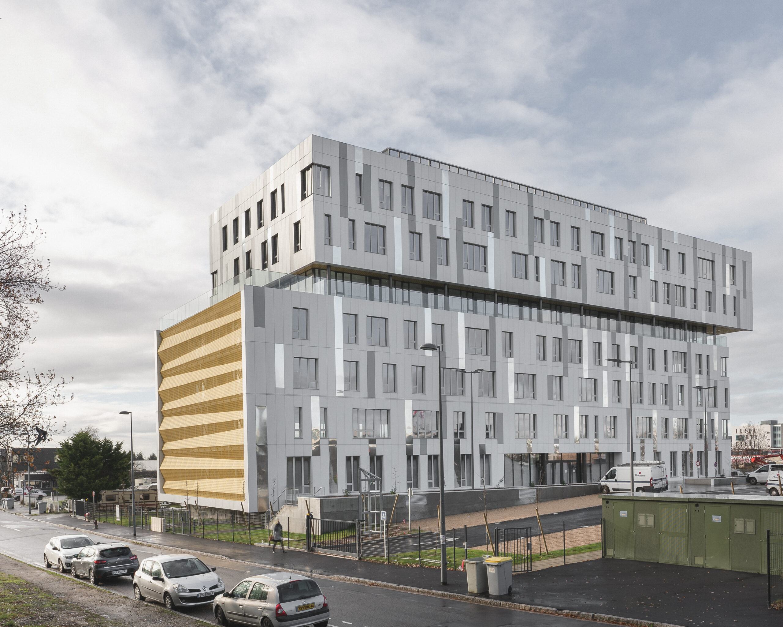 L’immeuble Oxane, livré en 2020 à Saint-Herblain, à l’ouest de Nantes, s’impose comme un signal architectural fort en rive paysagère du périphérique nantais. Conçu par Sud Architectes pour le Groupe Duval, ce bâtiment tertiaire de 7 200 m² (R+6) intègre des bureaux modulables, un niveau d’exception en R+4, ainsi que des services mutualisés comprenant restauration inter-entreprise, conciergerie et parkings semi-enterrés et extérieurs. Architecturalement, Oxane joue sur un décalage de volumes créant une “faille habitée” — un étage vitré encadré de terrasses offrant une vue panoramique à 360° —, rehaussé par une façade en origami métallique doré qui capte la lumière de manière changeante. Le volume supérieur forme un porte-à-faux vers le périphérique, tandis que le retrait côté opposé favorise une intégration douce dans le tissu pavillonnaire. Oxane se distingue par ses performances environnementales et son emplacement stratégique, à proximité du tramway, du Chronobus, du périphérique et du centre commercial Atlantis, faisant de lui un lieu de travail à la fois attractif et connecté.