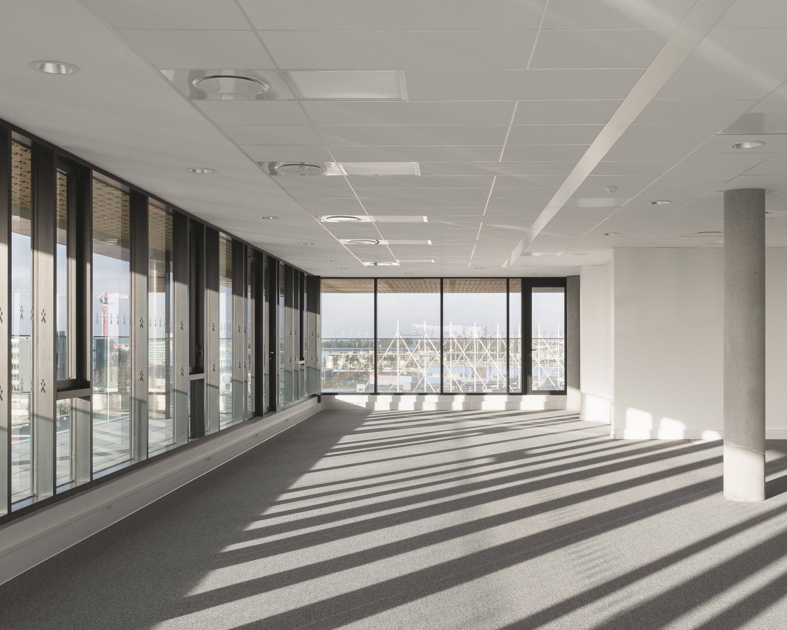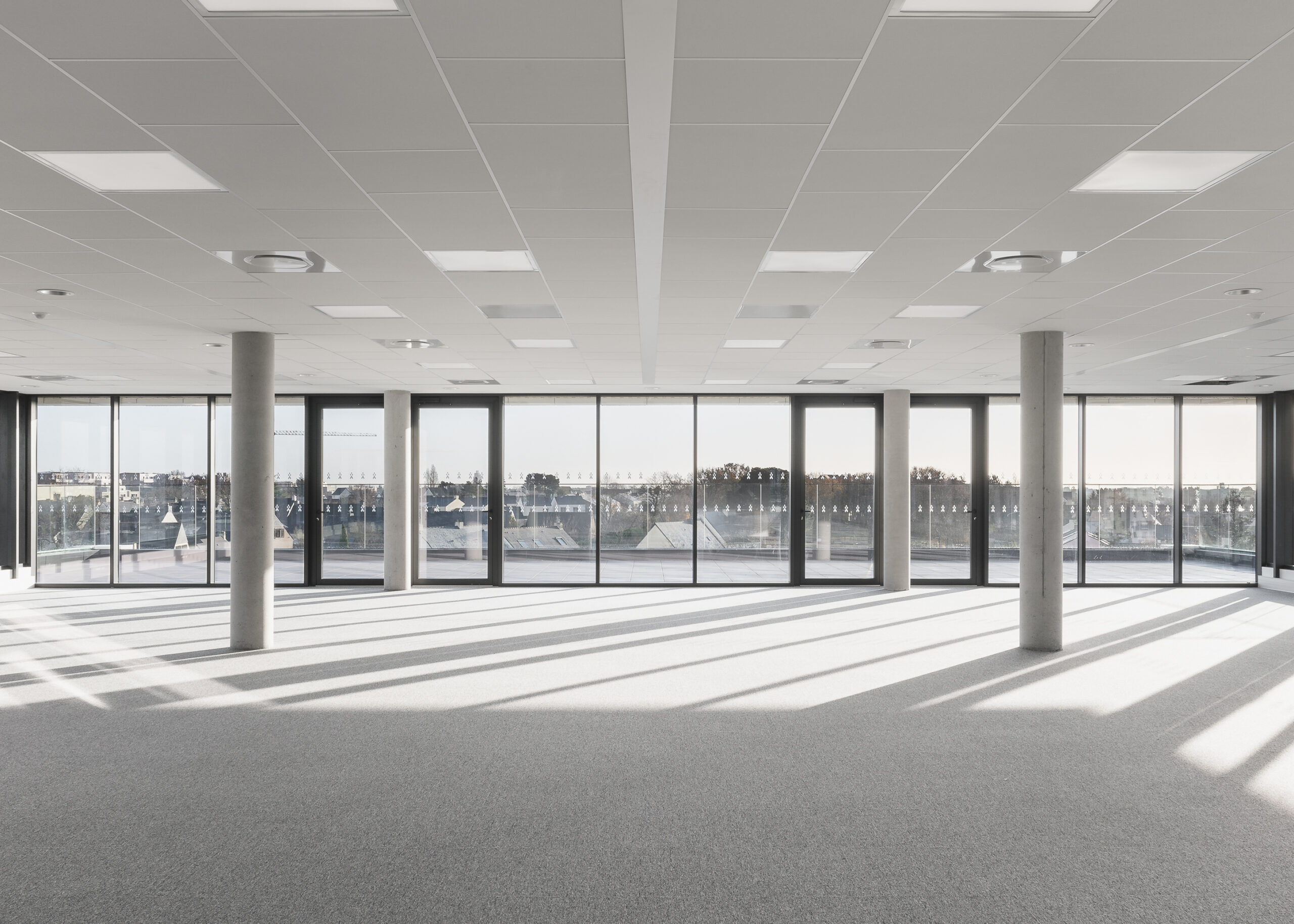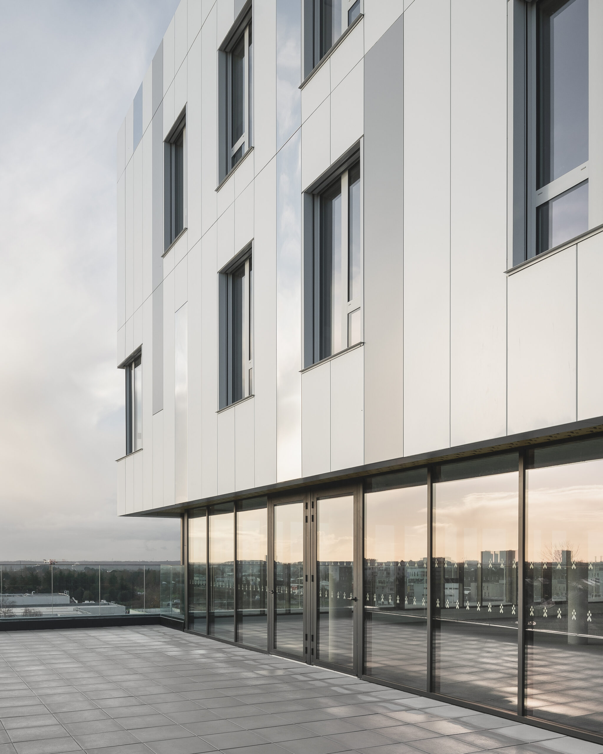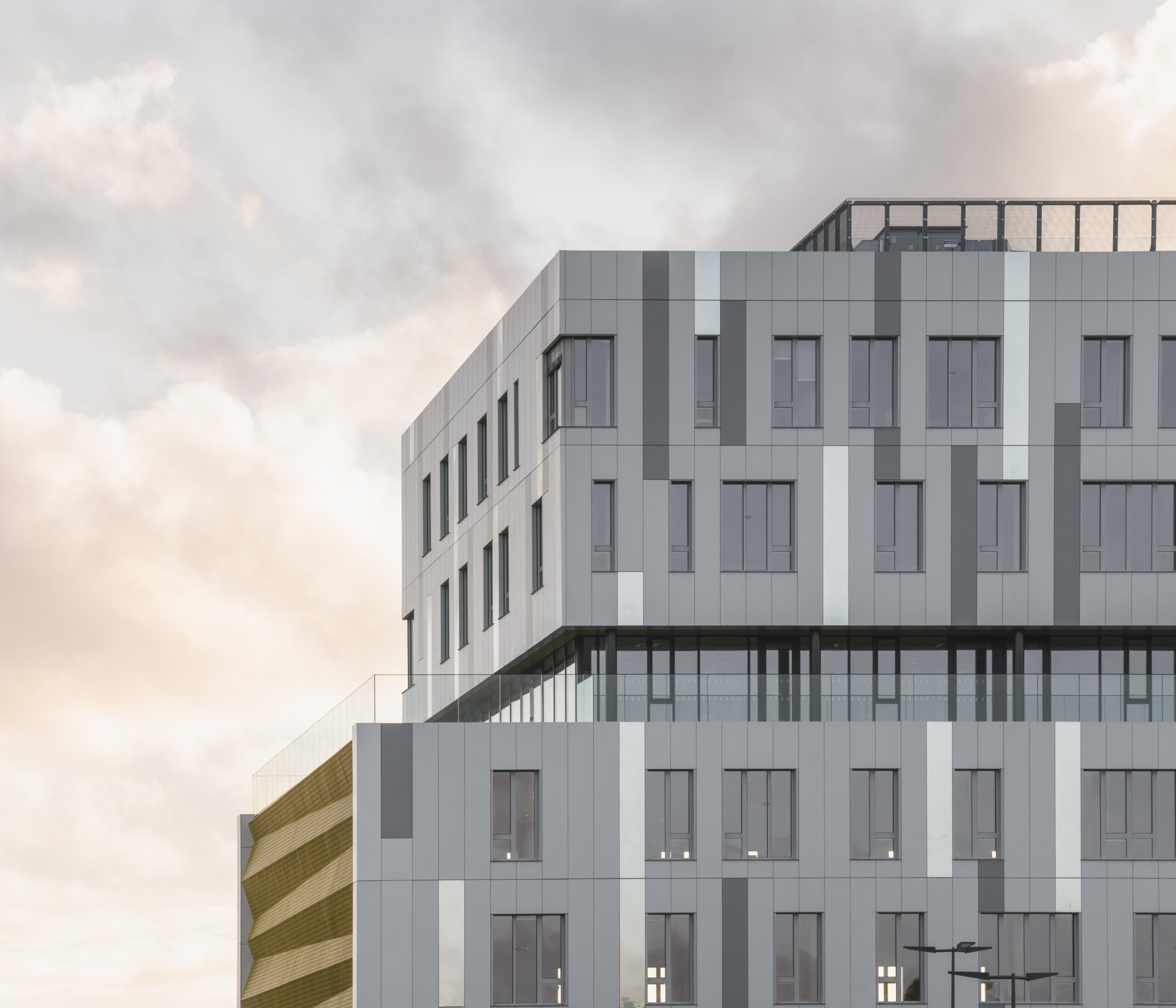 L’immeuble Oxane, livré en 2020 à Saint-Herblain, à l’ouest de Nantes, s’impose comme un signal architectural fort en rive paysagère du périphérique nantais. Conçu par Sud Architectes pour le Groupe Duval, ce bâtiment tertiaire de 7 200 m² (R+6) intègre des bureaux modulables, un niveau d’exception en R+4, ainsi que des services mutualisés comprenant restauration inter-entreprise, conciergerie et parkings semi-enterrés et extérieurs. Architecturalement, Oxane joue sur un décalage de volumes créant une “faille habitée” — un étage vitré encadré de terrasses offrant une vue panoramique à 360° —, rehaussé par une façade en origami métallique doré qui capte la lumière de manière changeante. Le volume supérieur forme un porte-à-faux vers le périphérique, tandis que le retrait côté opposé favorise une intégration douce dans le tissu pavillonnaire. Oxane se distingue par ses performances environnementales et son emplacement stratégique, à proximité du tramway, du Chronobus, du périphérique et du centre commercial Atlantis, faisant de lui un lieu de travail à la fois attractif et connecté.