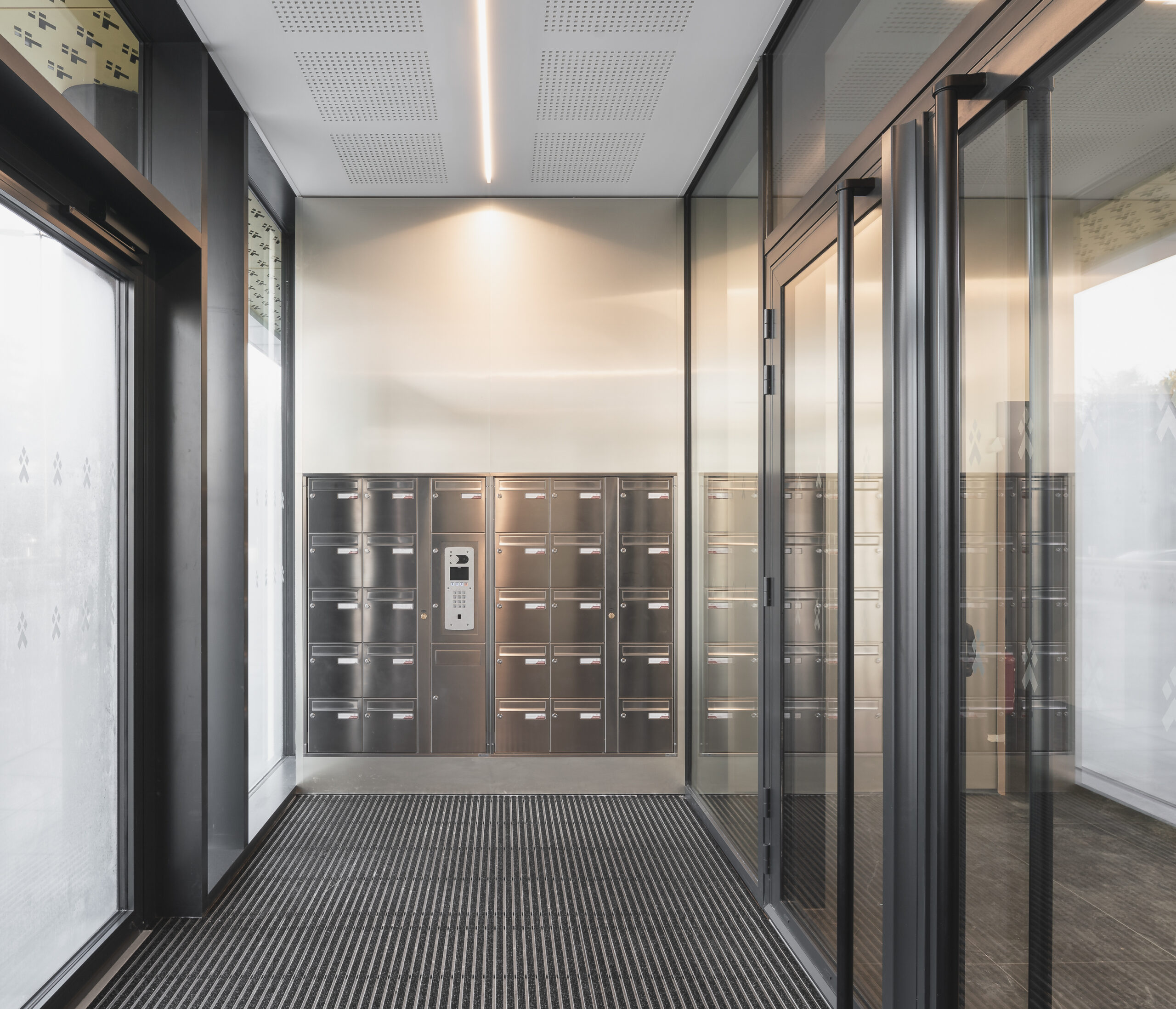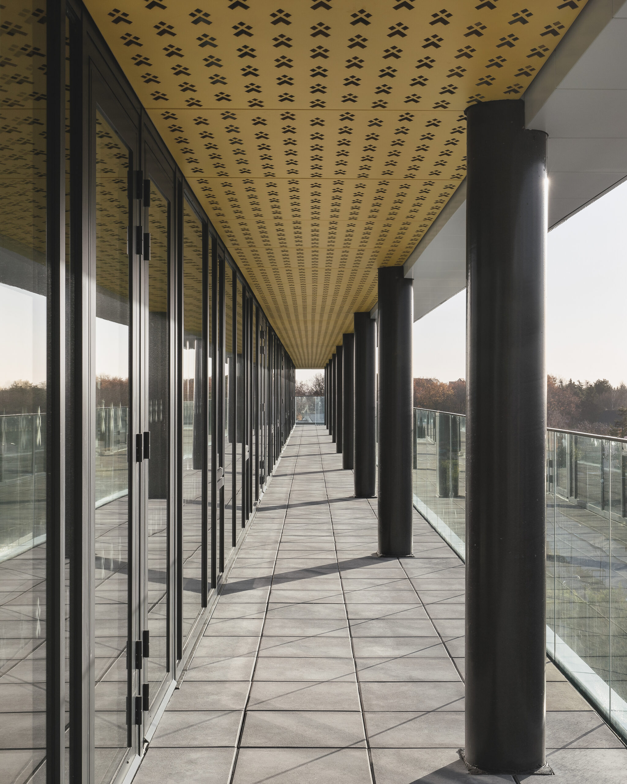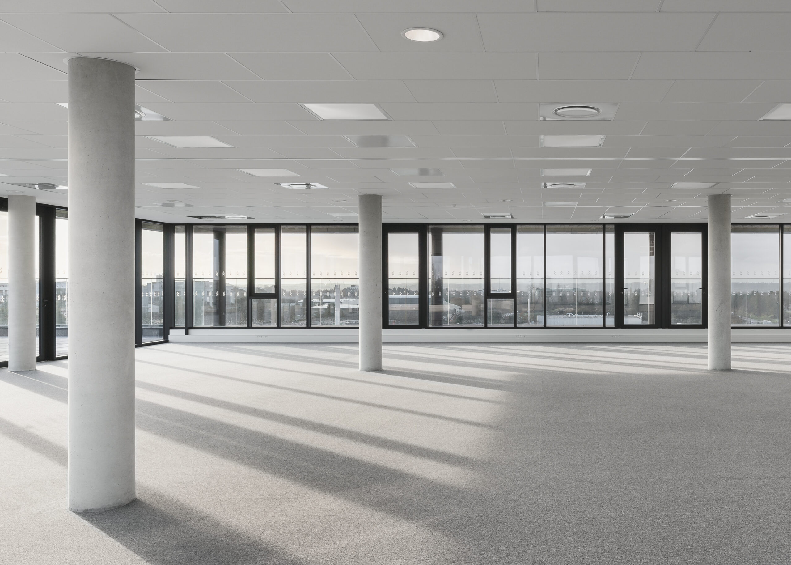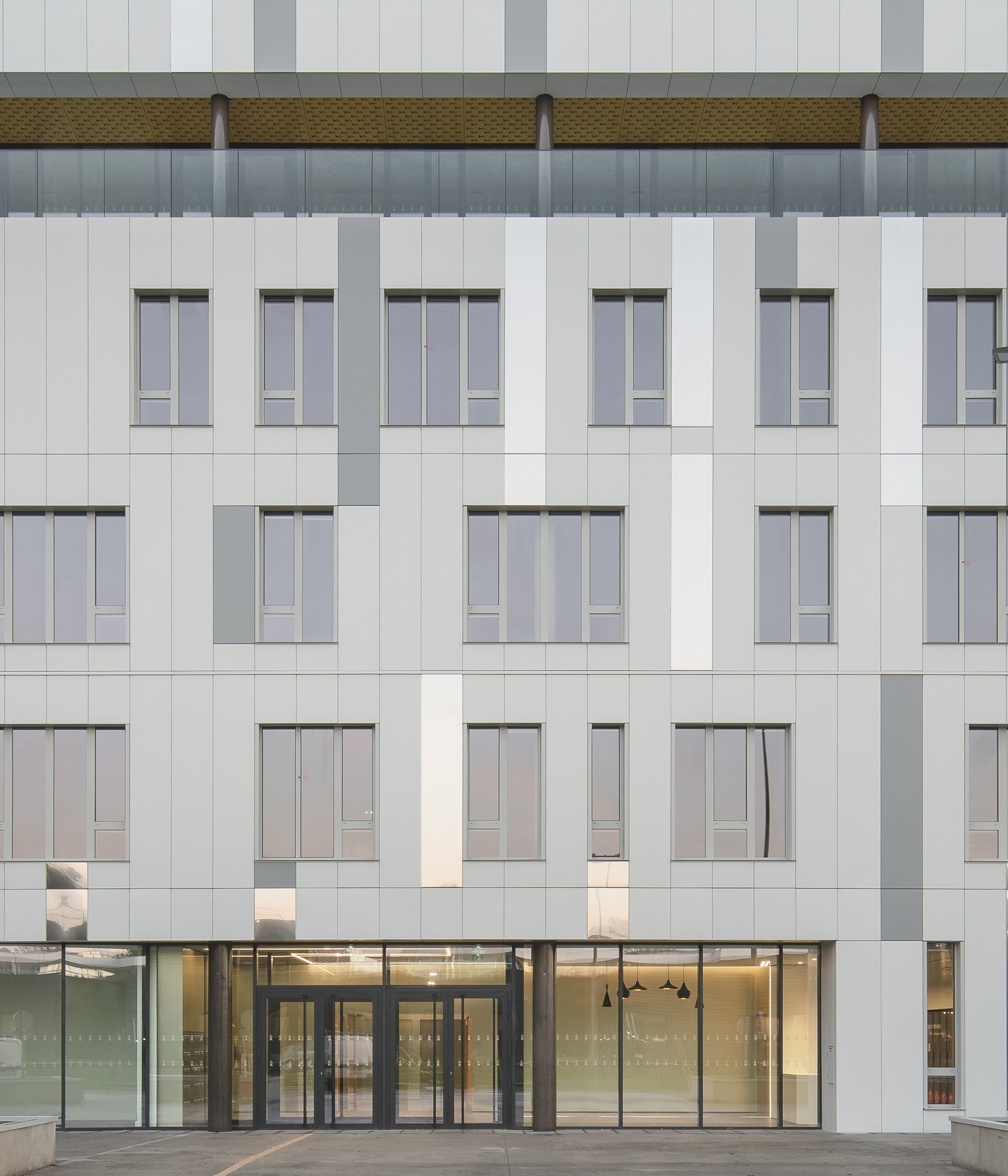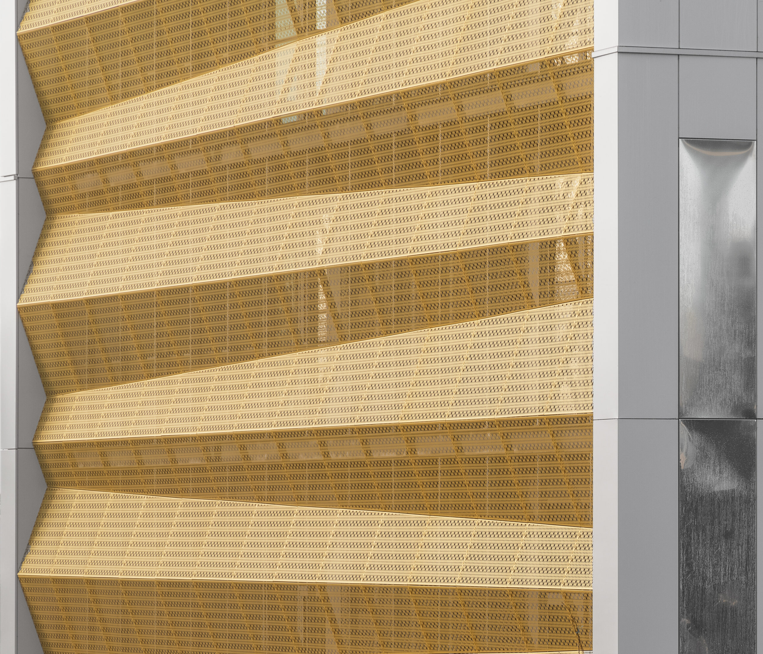 L’immeuble Oxane, livré en 2020 à Saint-Herblain, à l’ouest de Nantes, s’impose comme un signal architectural fort en rive paysagère du périphérique nantais. Conçu par Sud Architectes pour le Groupe Duval, ce bâtiment tertiaire de 7 200 m² (R+6) intègre des bureaux modulables, un niveau d’exception en R+4, ainsi que des services mutualisés comprenant restauration inter-entreprise, conciergerie et parkings semi-enterrés et extérieurs. Architecturalement, Oxane joue sur un décalage de volumes créant une “faille habitée” — un étage vitré encadré de terrasses offrant une vue panoramique à 360° —, rehaussé par une façade en origami métallique doré qui capte la lumière de manière changeante. Le volume supérieur forme un porte-à-faux vers le périphérique, tandis que le retrait côté opposé favorise une intégration douce dans le tissu pavillonnaire. Oxane se distingue par ses performances environnementales et son emplacement stratégique, à proximité du tramway, du Chronobus, du périphérique et du centre commercial Atlantis, faisant de lui un lieu de travail à la fois attractif et connecté.